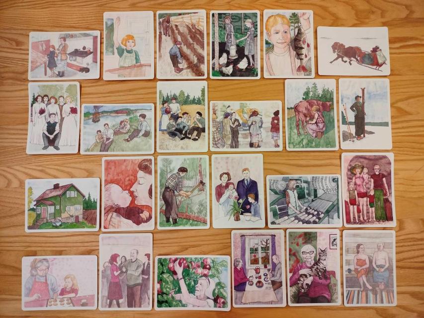 -24 käsinmaalattua, Suomessa painettua A5-kokoista korttia